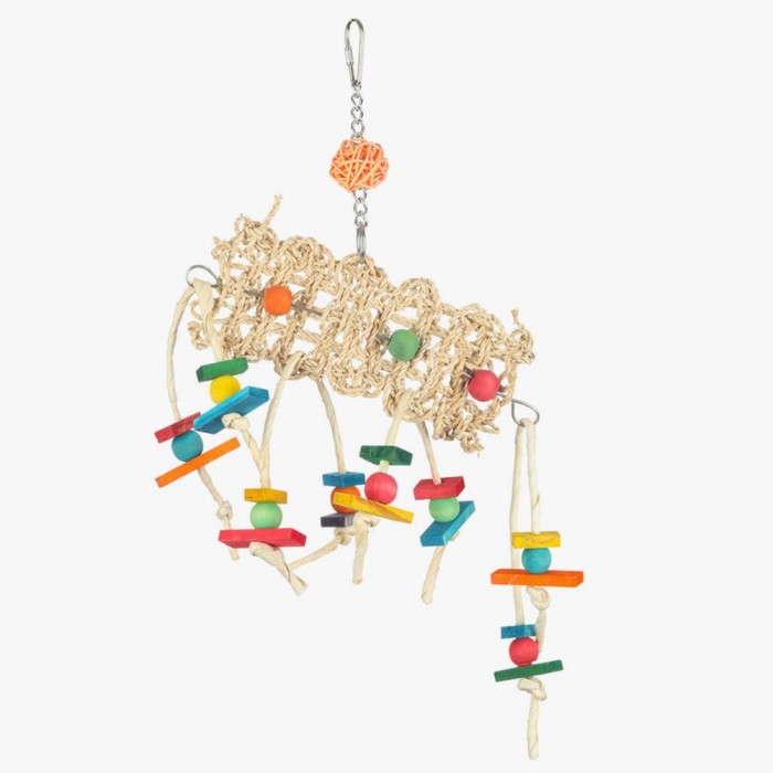 Hanging chew toy made from natural materials. A woven, seagrass patch threaded onto a bar with wooden shapes and natural banana leaf cord. A small vine ball is threaded onto the hanging chain.