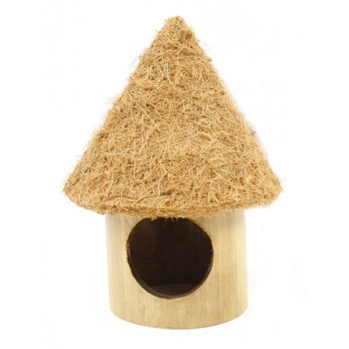 Small hut made from a slice of bamboo with a round entry hole topped with a pressed coco fibre roof.