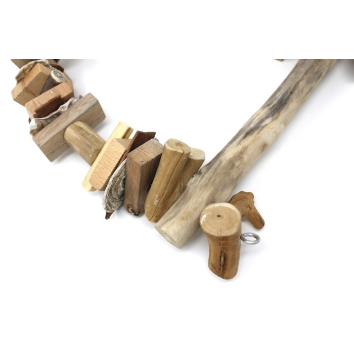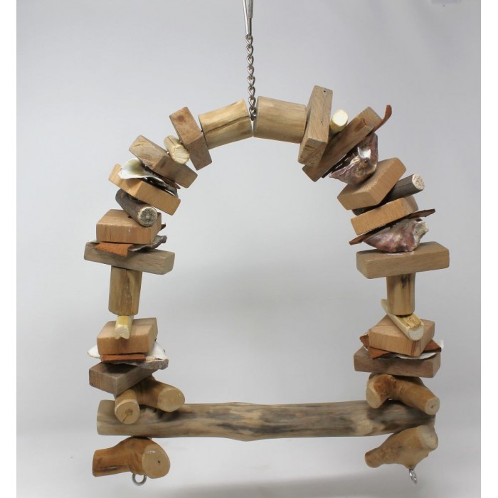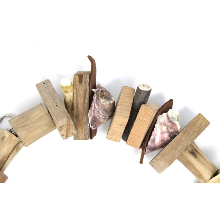 • Made from a java perch with an arch of  wooden shapes, large shells and leather slices